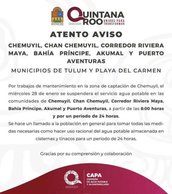 La Comisión de Agua Potable y Alcantarillado (CAPA) informó que este miércoles se llevará a cabo una suspensión temporal del suministro de agua potable en un amplio sector de la Riviera Maya, que abarca desde Chemuyil, en el municipio de Tulum, hasta Puerto Aventuras, al sur de Playa del Carmen.