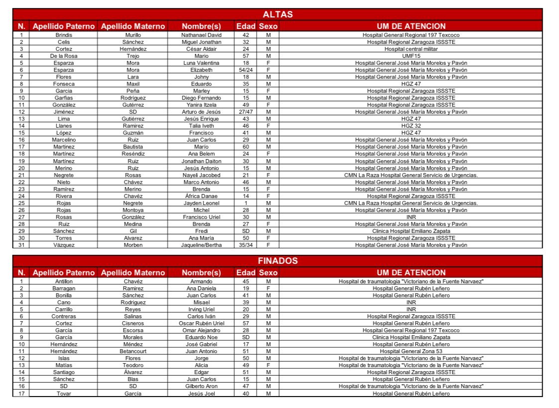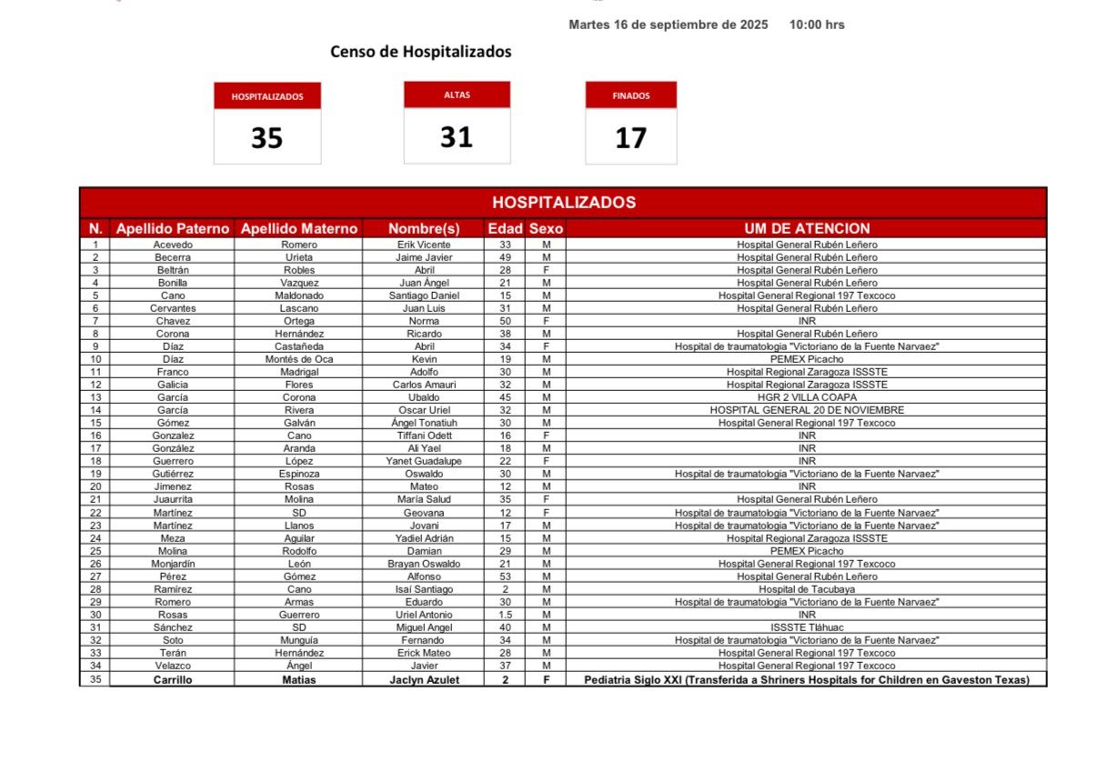 Las imágenes asociadas a los reportes incluyen infografías oficiales con el censo de hospitalizados, altas y fallecidos, detallando nombres, edades, sexos y unidades médicas de atención. Por ejemplo, entre los hospitalizados se encuentran personas de diversas edades, desde niños de 2 años hasta adultos mayores, atendidos en hospitales como el General Rubén Leñero, el de Traumatología “Victorio de la Fuente Narváez” y otros centros especializados.